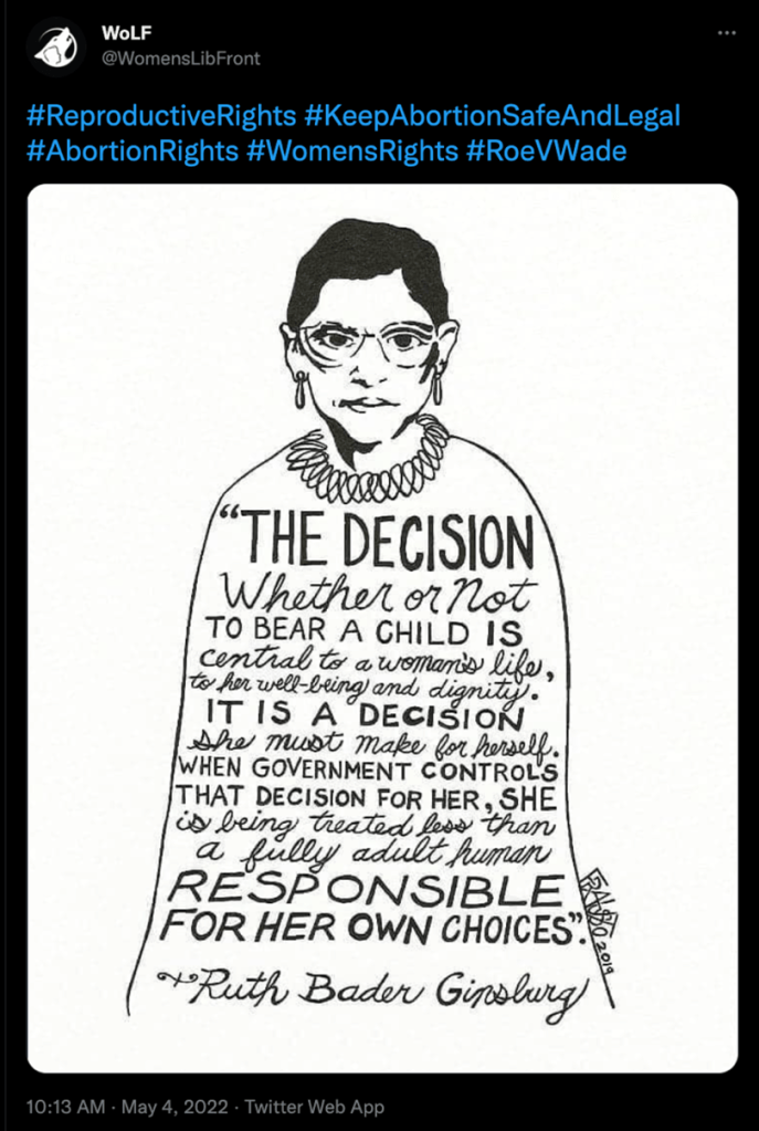 When the Supreme Court’s draft opinion in Dobbs v. Jackson Women’s Health Organization hit the internet earlier this month signaling the imminent end of abortion rightsin the United States, a group of feminists known as Trans-Exclusionary Radical Feminists (TERFs) on account of their belief that trans women should be excluded from the category of women had thoughts. For example, on the day after Politico broke the Dobbs story, Women’s Liberation Front (WoLF), an anti-trans feminist group best known for filing an amicus brief in R.G. & G.R. Harris Funeral Homes Inc. v. Equal Employment Opportunity Commission opposing the extension of Title VII sex-discrimination protections to trans people, interrupted their usual rhythm of tweets demonizing transwomen as rapists and child murderers to share a quote from Justice Ruth Bader Ginsburg about the importance of bodily autonomy and reproductive choice. “The decision whether or not to bear a child is central to a woman’s life, to her well-being and dignity,” WoLF declared via RBG meme; “It is a decision she must make for herself. When the government controls that decision for her, she is being treated less than a fully adult human responsible for her own choices.”