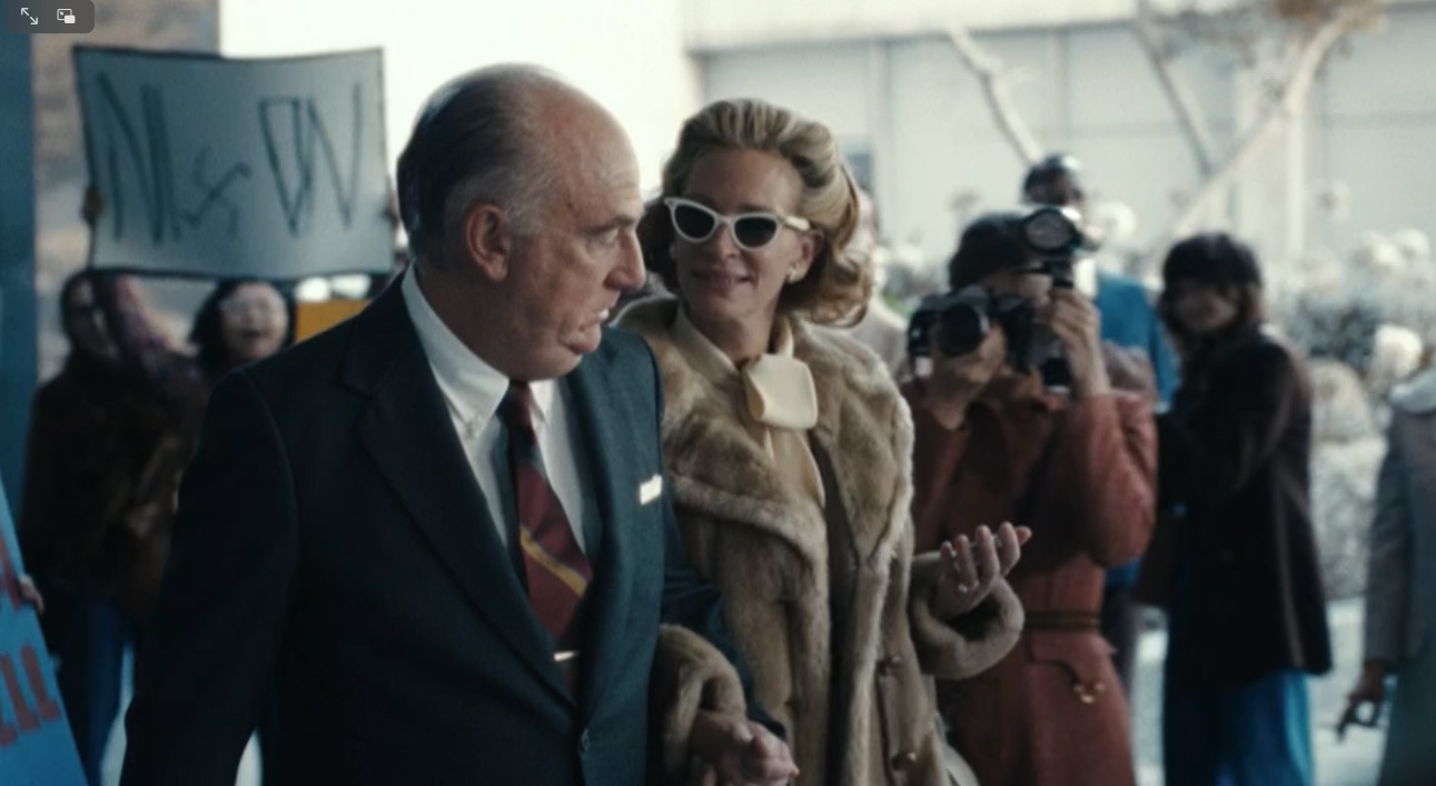 Featured image: Julia Roberts and Sean Penn as Martha and John Mitchell in Gaslit (2022), walking by antiwar demonstrators.