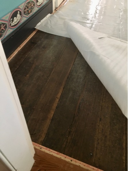 In August 2021, the original 1818 Guesthouse floors were revealed after years under laminate and oilcloth. Photo by Maria DiBenigno, 2021.