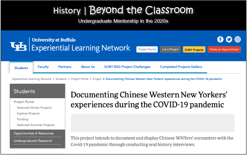 This project originated in my own oral history research., I documented the experiences of Chinese immigrants in Western New York during the pandemic. As a historian, Buffalonian resident, and victim of hate speech, I use my expertise in recording the difficulties Asian people encounter in the United States. During the implementation of this project, I noted its instructional use for college students. While the study of history can often seem remote from students’ everyday lives and distant from their neighborhoods, engagement with recent COVID-19 histories and local communities offered a fresh learning opportunity. With a focus on public history, I devised a research project that trained undergraduates to produce historical scholarship and disseminate academic knowledge about issues that impacted their lives and communities. In the summer of 2022, I posted the call for team members on the Project Portal of Experiential Learning Network at my home institution as follows. In a few weeks, I successfully recruited three college students to actively participate in my project.