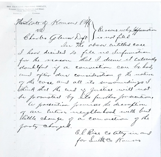 “Reasons why Information is not filed,” The State of Kansas v. Charles Glenn (1895), Case File No. 2453, Smith County District Court, Smith County, Kansas.