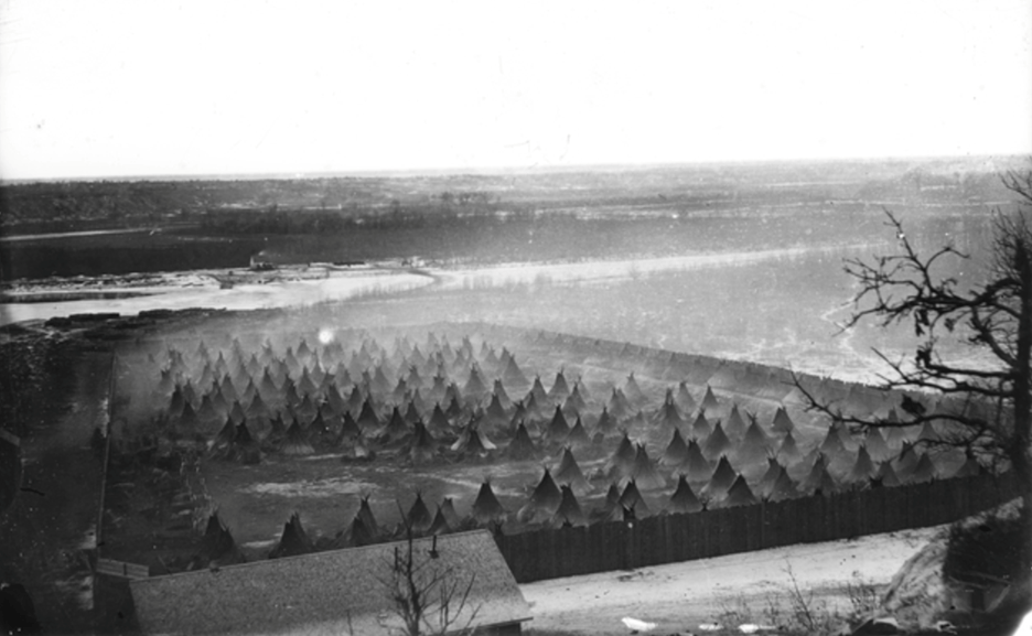 A view of the Dakota concentration camp at Fort Snelling, St. Paul, Minnesota, courtesy of the Minnesota Historical Society.